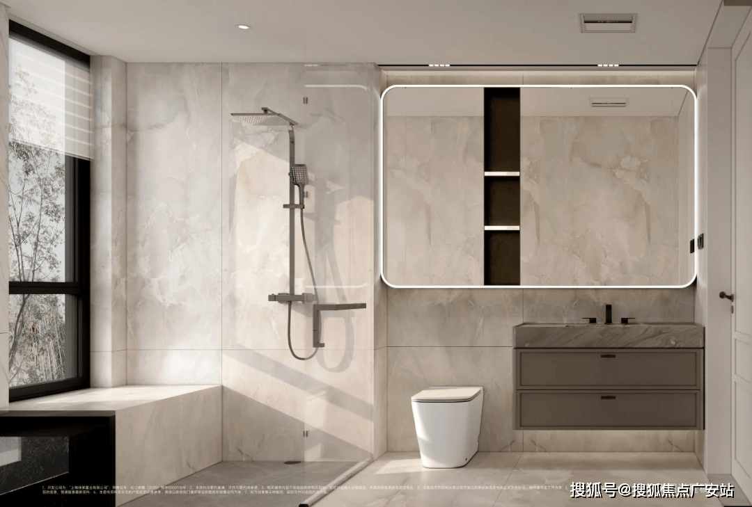 配备美妆龙头,大容量镜柜可收纳洗漱用品,利用墙面空间设置壁龛,便于存放毛巾、衣物便于取用。