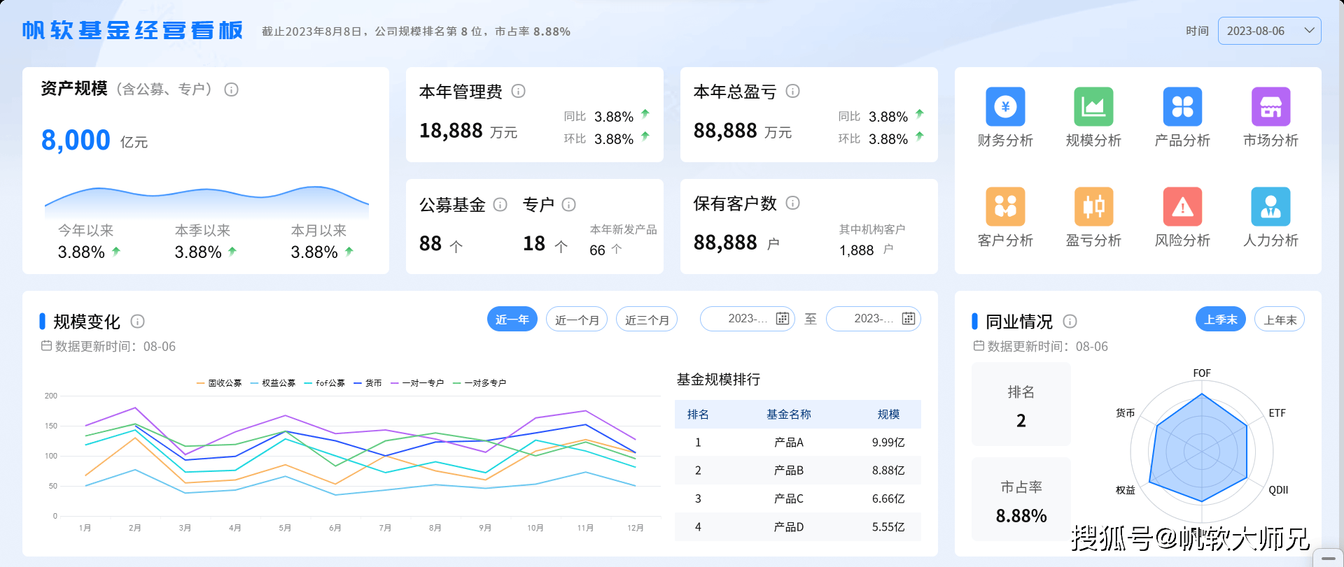 行业地位方面,公司市占率为8.88%,在竞争中保持前列。旗下产品A、B、C规模均超5亿,位居规模排行前列,形成了核心产品梯队。