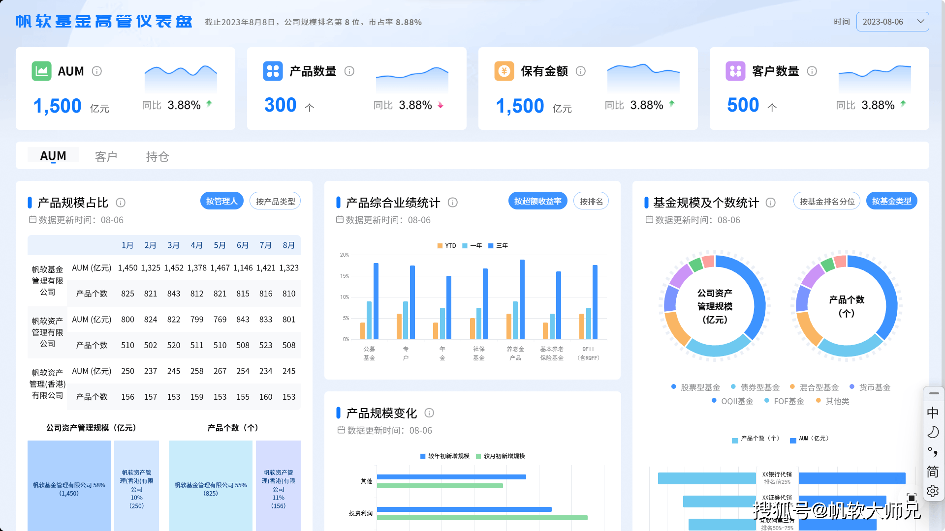 根据这份看板,上面呈现资产规模、管理费、保有客户数等关键数据,直观展示基金整体经营成果: