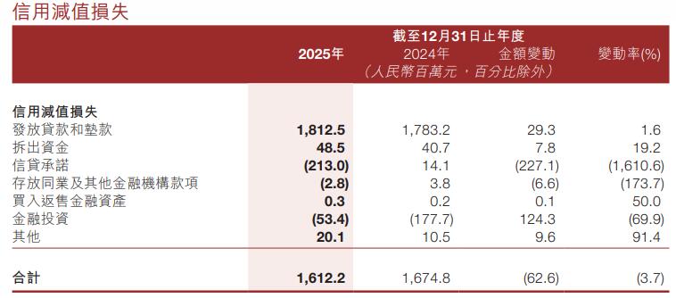 晋商银行信用减值损失截至2025年12月31日止年度为1,612.2百万元,较截至2024年12月31日止年度的1,674.8百万元减少3.7%。