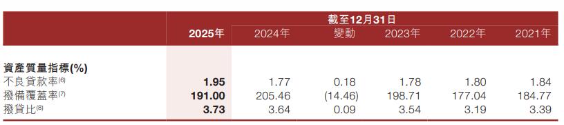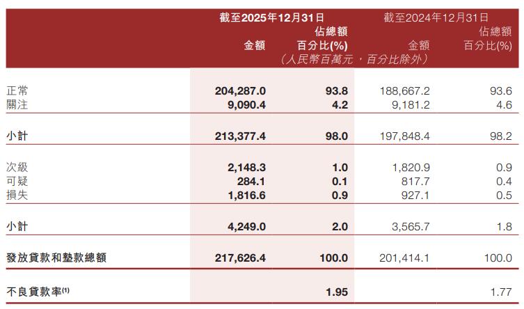 截至2025年12月31日,晋商银行不良贷款为4,249.0百万元,较2024年12月31日增加683.3百万元,不良贷款率为1.95%,较2024年12月31日上升0.18个百分点。