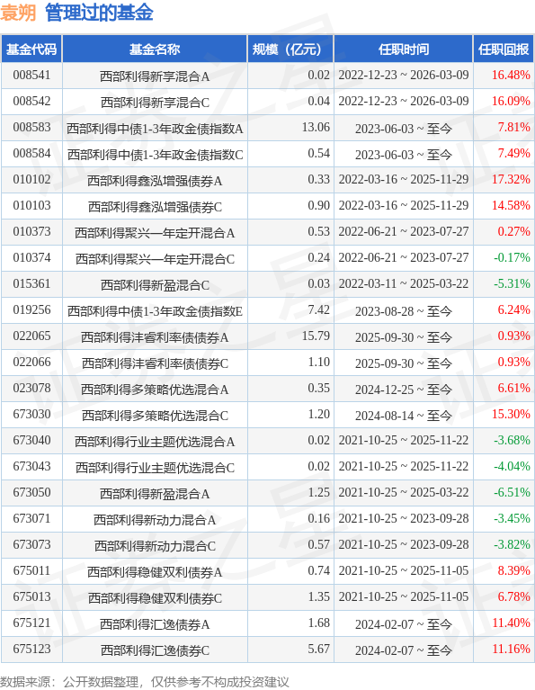 2026-04-05彩票,彩票平台,彩票网站,彩票APP下载,六合彩,快三证券之星消息,2026年4月3日,西部利得双季享6个月持有期债券(023798)发布公告,增聘袁朔为基金经理,任职日期自2026年4月3日起,变更后西部利得双季享6个月持有期债券(023798)的基金经理为袁朔,严志勇。截止2026年4月2日,西部利得双季享6个月持有期债券净值为1.0125,较上一日下跌0.02%。