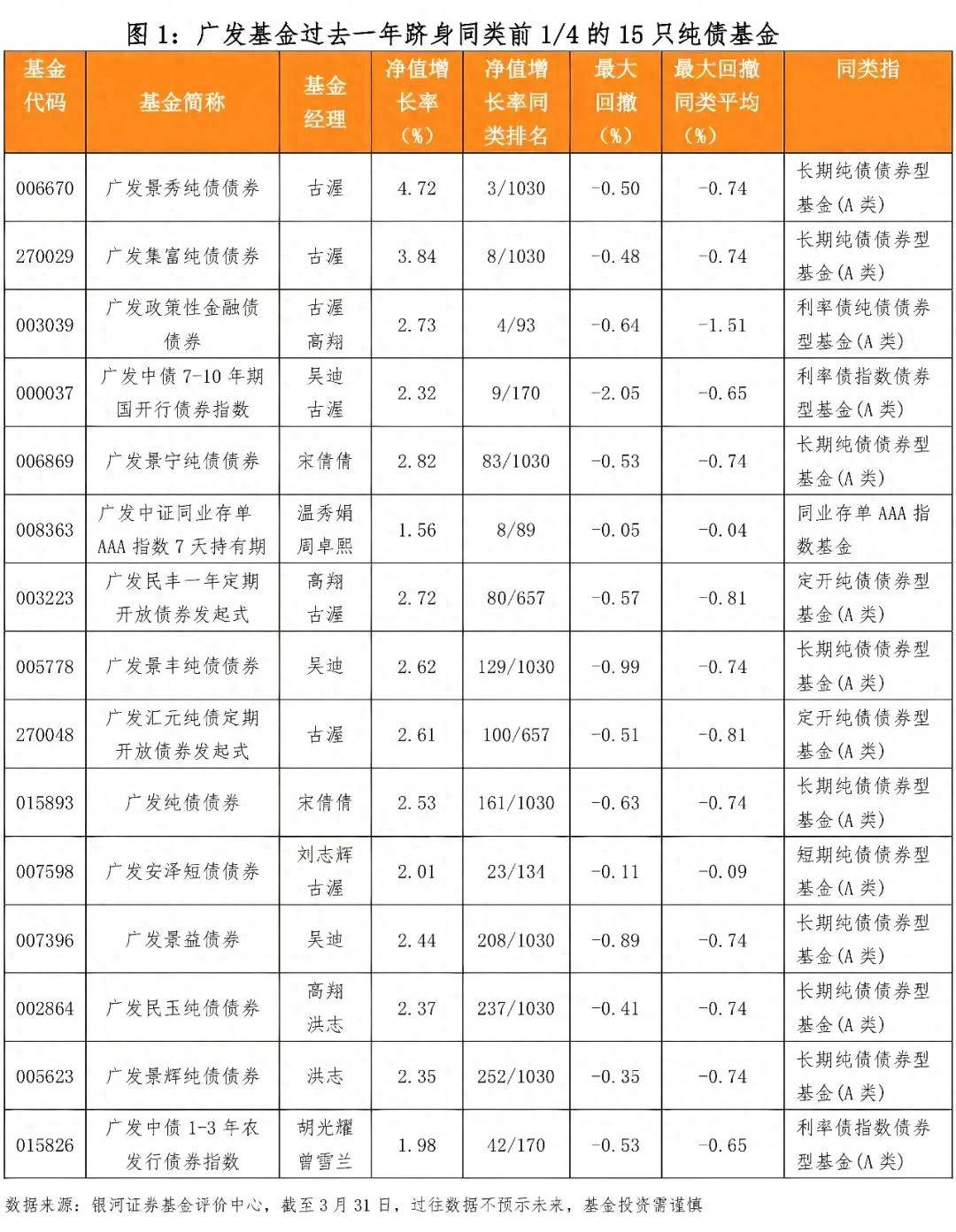 过去一年,纯债市场面临诸多挑战,广发基金固收团队通过主动择券和控制回撤取得了良好的业绩。银河证券基金评价中心数据显示,截至2026年3月31日,广发基金旗下共有15只纯债基金过去一年业绩排名同类前25%分位,且其中10只产品的同期最大回撤低于同类最大回撤平均值,展现了较好的收益风险性价比。