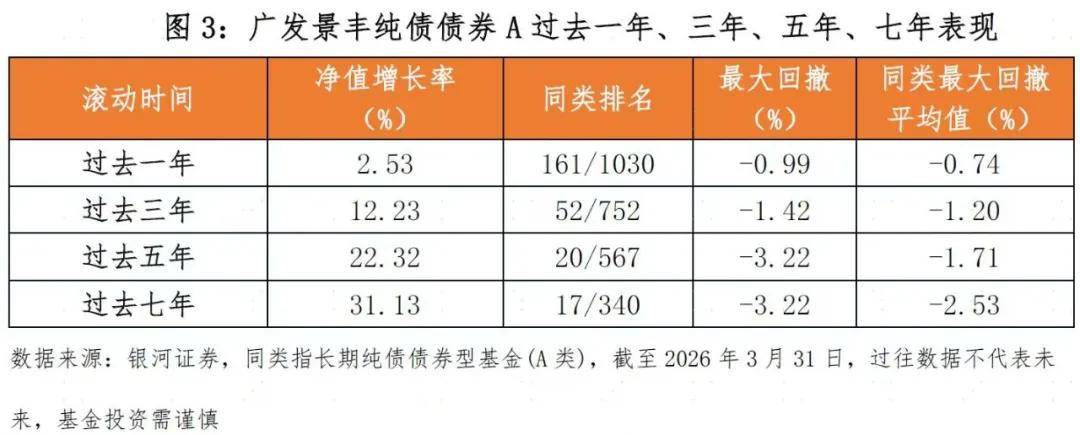 国泰海通证券数据显示,截至2026年3月31日,广发基金最近十年的固定收益类资产超额收益率达34.52%,在大型固定收益类基金公司中排名第5(5/17)。与此同时,广发基金旗下多只纯债基金取得短中长期不同阶段的良好业绩,展现出在复杂多变的市场环境中获取长期阿尔法收益的卓越能力。