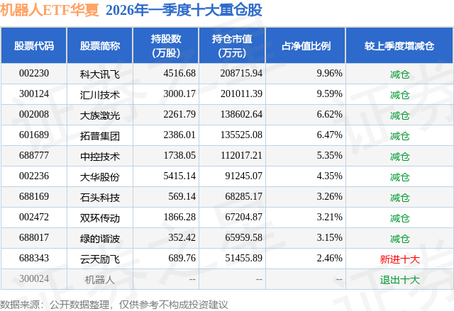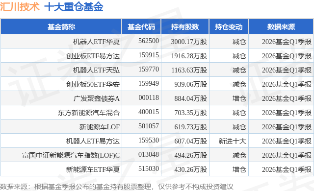 根据2026基金Q1季报公募基金重仓股数据,重仓该股的公募基金共199家,其中持有数量最多的公募基金为华夏基金的机器人ETF华夏。机器人ETF华夏目前规模为209.52亿元,最新净值1.0106(4月28日),较上一交易日下跌1.98%,近一年上涨23.41%。该公募基金现任基金经理为华龙。华龙在任的基金产品包括:华夏饲料豆粕期货ETF联接A,管理时间为2022年8月22日至今,期间收益率为20.73%;华夏上证50AH优选指数A,管理时间为2022年8月22日至今,期间收益率为30.17%;华夏中证机器人ETF发起式联接A,管理时间为2023年5月31日至今,期间收益率为22.38%;华夏消费电子ETF联接A,管理时间为2023年6月2日至今,期间收益率为89.2%。